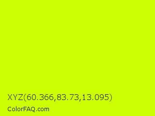 XYZ 60.366,83.73,13.095 Color is a normal lime color and the nearest color is Electric Lime #ccff00. Hex code #ccfe04 and RGB value is rgb(204,254,4). In RGB color space, this color is composed of 80% red, 100% green, 2% blue, In CMYK color space, this color is composed of 20% cyan, 0% magenta, 98% yellow , 0% black , In HSL color space, this color has a hue angle of 72° , 99% saturation and 51% lightness.