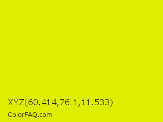 XYZ 60.414,76.1,11.533 Color is a normal yellow color and the nearest color is Peridot #e6e200. Hex code #deed01 and RGB value is rgb(222,237,1). In RGB color space, this color is composed of 87% red, 93% green, 0% blue, In CMYK color space, this color is composed of 6% cyan, 0% magenta, 100% yellow , 7% black , In HSL color space, this color has a hue angle of 64° , 99% saturation and 47% lightness.