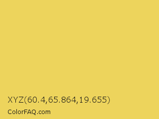 XYZ 60.4,65.864,19.655 Color is a light yellow color and the nearest color is Confetti #e9d75a. Hex code #edd45c and RGB value is rgb(237,212,92). In RGB color space, this color is composed of 93% red, 83% green, 36% blue, In CMYK color space, this color is composed of 0% cyan, 11% magenta, 61% yellow , 7% black , In HSL color space, this color has a hue angle of 50° , 80% saturation and 65% lightness.