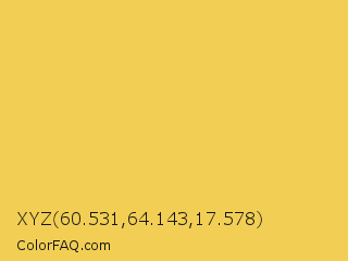 XYZ 60.531,64.143,17.578 Color is a light yellow color and the nearest color is Cream Can #f5c85c. Hex code #f2cf54 and RGB value is rgb(242,207,84). In RGB color space, this color is composed of 95% red, 81% green, 33% blue, In CMYK color space, this color is composed of 0% cyan, 14% magenta, 65% yellow , 5% black , In HSL color space, this color has a hue angle of 47° , 86% saturation and 64% lightness.