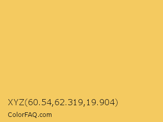 XYZ 60.54,62.319,19.904 Color is a light orange color and the nearest color is Cream Can #f5c85c. Hex code #f4ca60 and RGB value is rgb(244,202,96). In RGB color space, this color is composed of 96% red, 79% green, 38% blue, In CMYK color space, this color is composed of 0% cyan, 17% magenta, 61% yellow , 4% black , In HSL color space, this color has a hue angle of 43° , 87% saturation and 67% lightness.