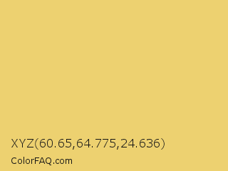 XYZ 60.65,64.775,24.636 Color is a light yellow color and the nearest color is Hansa Yellow #e9d66b. Hex code #edd170 and RGB value is rgb(237,209,112). In RGB color space, this color is composed of 93% red, 82% green, 44% blue, In CMYK color space, this color is composed of 0% cyan, 12% magenta, 53% yellow , 7% black , In HSL color space, this color has a hue angle of 47° , 78% saturation and 68% lightness.