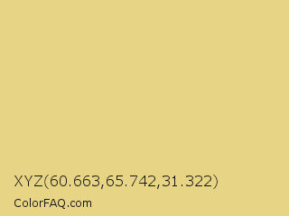 XYZ 60.663,65.742,31.322 Color is a light yellow color and the nearest color is Putty #e7cd8c. Hex code #e7d484 and RGB value is rgb(231,212,132). In RGB color space, this color is composed of 91% red, 83% green, 52% blue, In CMYK color space, this color is composed of 0% cyan, 8% magenta, 43% yellow , 9% black , In HSL color space, this color has a hue angle of 48° , 67% saturation and 71% lightness.
