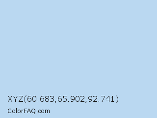 XYZ 60.683,65.902,92.741 Color is a very light blue color and the nearest color is Spindle #b6d1ea. Hex code #bad8f1 and RGB value is rgb(186,216,241). In RGB color space, this color is composed of 73% red, 85% green, 95% blue, In CMYK color space, this color is composed of 23% cyan, 10% magenta, 0% yellow , 5% black , In HSL color space, this color has a hue angle of 207° , 66% saturation and 84% lightness.