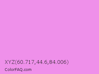 XYZ 60.717,44.6,84.006 Color is a light magenta color and the nearest color is Lavender Magenta #ee82ee. Hex code #ef91eb and RGB value is rgb(239,145,235). In RGB color space, this color is composed of 94% red, 57% green, 92% blue, In CMYK color space, this color is composed of 0% cyan, 39% magenta, 2% yellow , 6% black , In HSL color space, this color has a hue angle of 303° , 75% saturation and 75% lightness.