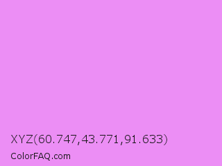 XYZ 60.747,43.771,91.633 Color is a light magenta color and the nearest color is Lavender Magenta #ee82ee. Hex code #ec8ef5 and RGB value is rgb(236,142,245). In RGB color space, this color is composed of 93% red, 56% green, 96% blue, In CMYK color space, this color is composed of 4% cyan, 42% magenta, 0% yellow , 4% black , In HSL color space, this color has a hue angle of 295° , 84% saturation and 76% lightness.