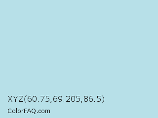 XYZ 60.75,69.205,86.5 Color is a very light cyan color and the nearest color is Powder Blue #b0e0e6. Hex code #b7e0e8 and RGB value is rgb(183,224,232). In RGB color space, this color is composed of 72% red, 88% green, 91% blue, In CMYK color space, this color is composed of 21% cyan, 3% magenta, 0% yellow , 9% black , In HSL color space, this color has a hue angle of 190° , 52% saturation and 81% lightness.