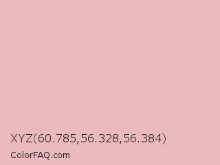 XYZ 60.785,56.328,56.384 Color is a very light red color and the nearest color is Cavern Pink #e3bebe. Hex code #eababe and RGB value is rgb(234,186,190). In RGB color space, this color is composed of 92% red, 73% green, 75% blue, In CMYK color space, this color is composed of 0% cyan, 21% magenta, 19% yellow , 8% black , In HSL color space, this color has a hue angle of 355° , 53% saturation and 82% lightness.