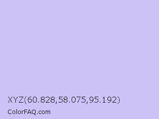 XYZ 60.828,58.075,95.192 Color is a very light indigo color and the nearest color is Perfume #d0bef8. Hex code #ccc2f6 and RGB value is rgb(204,194,246). In RGB color space, this color is composed of 80% red, 76% green, 96% blue, In CMYK color space, this color is composed of 17% cyan, 21% magenta, 0% yellow , 4% black , In HSL color space, this color has a hue angle of 252° , 74% saturation and 86% lightness.