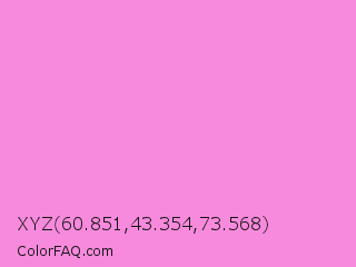 XYZ 60.851,43.354,73.568 Color is a light magenta color and the nearest color is Pale Magenta #f984e5. Hex code #f88add and RGB value is rgb(248,138,221). In RGB color space, this color is composed of 97% red, 54% green, 87% blue, In CMYK color space, this color is composed of 0% cyan, 44% magenta, 11% yellow , 3% black , In HSL color space, this color has a hue angle of 315° , 89% saturation and 76% lightness.