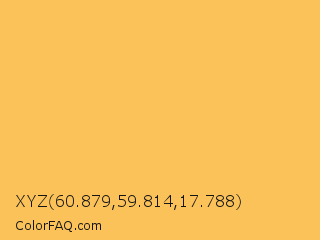 XYZ 60.879,59.814,17.788 Color is a light orange color and the nearest color is Saffron Mango #f9bf58. Hex code #fbc259 and RGB value is rgb(251,194,89). In RGB color space, this color is composed of 98% red, 76% green, 35% blue, In CMYK color space, this color is composed of 0% cyan, 23% magenta, 65% yellow , 2% black , In HSL color space, this color has a hue angle of 39° , 95% saturation and 67% lightness.