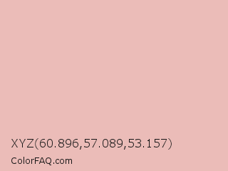 XYZ 60.896,57.089,53.157 Color is a very light red color and the nearest color is Rose Fog #e7bcb4. Hex code #ebbcb8 and RGB value is rgb(235,188,184). In RGB color space, this color is composed of 92% red, 74% green, 72% blue, In CMYK color space, this color is composed of 0% cyan, 20% magenta, 22% yellow , 8% black , In HSL color space, this color has a hue angle of 5° , 56% saturation and 82% lightness.