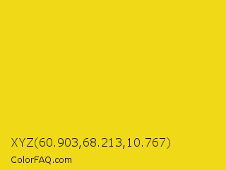 XYZ 60.903,68.213,10.767 Color is a normal yellow color and the nearest color is Ripe Lemon #f4d81c. Hex code #f0d917 and RGB value is rgb(240,217,23). In RGB color space, this color is composed of 94% red, 85% green, 9% blue, In CMYK color space, this color is composed of 0% cyan, 10% magenta, 90% yellow , 6% black , In HSL color space, this color has a hue angle of 54° , 88% saturation and 52% lightness.