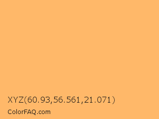 XYZ 60.93,56.561,21.071 Color is a light orange color and the nearest color is Rajah #f7b668. Hex code #ffb869 and RGB value is rgb(255,184,105). In RGB color space, this color is composed of 100% red, 72% green, 41% blue, In CMYK color space, this color is composed of 0% cyan, 28% magenta, 59% yellow , 0% black , In HSL color space, this color has a hue angle of 32° , 100% saturation and 71% lightness.