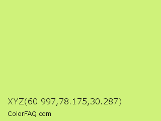 XYZ 60.997,78.175,30.287 Color is a light lime color and the nearest color is Sulu #c1f07c. Hex code #cff27a and RGB value is rgb(207,242,122). In RGB color space, this color is composed of 81% red, 95% green, 48% blue, In CMYK color space, this color is composed of 14% cyan, 0% magenta, 50% yellow , 5% black , In HSL color space, this color has a hue angle of 78° , 82% saturation and 71% lightness.