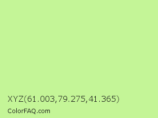 XYZ 61.003,79.275,41.365 Color is a light green color and the nearest color is Reef #c9ffa2. Hex code #c4f597 and RGB value is rgb(196,245,151). In RGB color space, this color is composed of 77% red, 96% green, 59% blue, In CMYK color space, this color is composed of 20% cyan, 0% magenta, 38% yellow , 4% black , In HSL color space, this color has a hue angle of 91° , 82% saturation and 78% lightness.