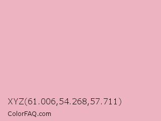 XYZ 61.006,54.268,57.711 Color is a very light red color and the nearest color is Nadeshiko Pink #f6adc6. Hex code #eeb3c1 and RGB value is rgb(238,179,193). In RGB color space, this color is composed of 93% red, 70% green, 76% blue, In CMYK color space, this color is composed of 0% cyan, 25% magenta, 19% yellow , 7% black , In HSL color space, this color has a hue angle of 346° , 63% saturation and 82% lightness.