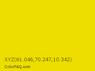 XYZ 61.046,70.247,10.342 Color is a normal yellow color and the nearest color is Titanium Yellow #eee600. Hex code #edde00 and RGB value is rgb(237,222,0). In RGB color space, this color is composed of 93% red, 87% green, 0% blue, In CMYK color space, this color is composed of 0% cyan, 6% magenta, 100% yellow , 7% black , In HSL color space, this color has a hue angle of 56° , 100% saturation and 46% lightness.