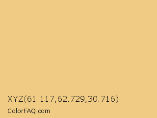 XYZ 61.117,62.729,30.716 Color is a light orange color and the nearest color is Putty #e7cd8c. Hex code #efcb84 and RGB value is rgb(239,203,132). In RGB color space, this color is composed of 94% red, 80% green, 52% blue, In CMYK color space, this color is composed of 0% cyan, 15% magenta, 45% yellow , 6% black , In HSL color space, this color has a hue angle of 40° , 77% saturation and 73% lightness.