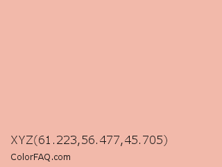 XYZ 61.223,56.477,45.705 Color is a very light red color and the nearest color is Melon Crayola #febaad. Hex code #f2b9aa and RGB value is rgb(242,185,170). In RGB color space, this color is composed of 95% red, 73% green, 67% blue, In CMYK color space, this color is composed of 0% cyan, 24% magenta, 30% yellow , 5% black , In HSL color space, this color has a hue angle of 13° , 73% saturation and 81% lightness.