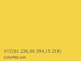 XYZ 61.236,66.394,15.218 Color is a light yellow color and the nearest color is Sandstorm #ecd540. Hex code #f2d445 and RGB value is rgb(242,212,69). In RGB color space, this color is composed of 95% red, 83% green, 27% blue, In CMYK color space, this color is composed of 0% cyan, 12% magenta, 71% yellow , 5% black , In HSL color space, this color has a hue angle of 50° , 87% saturation and 61% lightness.