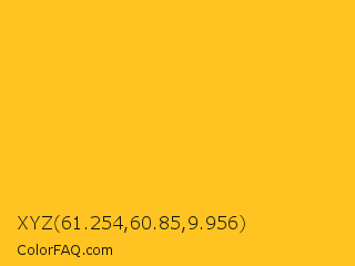 XYZ 61.254,60.85,9.956 Color is a normal orange color and the nearest color is Lightning Yellow #fcc01e. Hex code #ffc421 and RGB value is rgb(255,196,33). In RGB color space, this color is composed of 100% red, 77% green, 13% blue, In CMYK color space, this color is composed of 0% cyan, 23% magenta, 87% yellow , 0% black , In HSL color space, this color has a hue angle of 44° , 100% saturation and 56% lightness.
