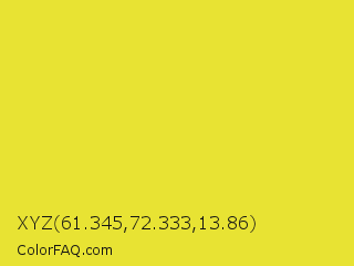 XYZ 61.345,72.333,13.86 Color is a normal yellow color and the nearest color is Dandelion #f0e130. Hex code #e8e333 and RGB value is rgb(232,227,51). In RGB color space, this color is composed of 91% red, 89% green, 20% blue, In CMYK color space, this color is composed of 0% cyan, 2% magenta, 78% yellow , 9% black , In HSL color space, this color has a hue angle of 58° , 80% saturation and 55% lightness.