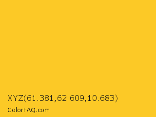 XYZ 61.381,62.609,10.683 Color is a normal yellow color and the nearest color is Lightning Yellow #fcc01e. Hex code #fcc926 and RGB value is rgb(252,201,38). In RGB color space, this color is composed of 99% red, 79% green, 15% blue, In CMYK color space, this color is composed of 0% cyan, 20% magenta, 85% yellow , 1% black , In HSL color space, this color has a hue angle of 46° , 97% saturation and 57% lightness.