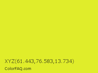 XYZ 61.443,76.583,13.734 Color is a normal yellow color and the nearest color is Pear #d1e231. Hex code #e0ed2a and RGB value is rgb(224,237,42). In RGB color space, this color is composed of 88% red, 93% green, 16% blue, In CMYK color space, this color is composed of 5% cyan, 0% magenta, 82% yellow , 7% black , In HSL color space, this color has a hue angle of 64° , 84% saturation and 55% lightness.