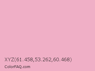 XYZ 61.458,53.262,60.468 Color is a very light rose color and the nearest color is Nadeshiko Pink #f6adc6. Hex code #f0afc6 and RGB value is rgb(240,175,198). In RGB color space, this color is composed of 94% red, 69% green, 78% blue, In CMYK color space, this color is composed of 0% cyan, 27% magenta, 18% yellow , 6% black , In HSL color space, this color has a hue angle of 339° , 68% saturation and 81% lightness.
