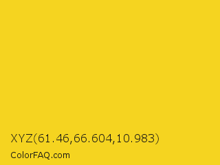 XYZ 61.46,66.604,10.983 Color is a normal yellow color and the nearest color is Ripe Lemon #f4d81c. Hex code #f5d420 and RGB value is rgb(245,212,32). In RGB color space, this color is composed of 96% red, 83% green, 13% blue, In CMYK color space, this color is composed of 0% cyan, 13% magenta, 87% yellow , 4% black , In HSL color space, this color has a hue angle of 51° , 91% saturation and 54% lightness.
