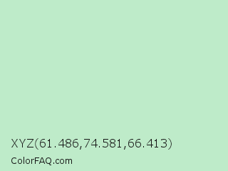 XYZ 61.486,74.581,66.413 Color is a very light green color and the nearest color is Madang #b7f0be. Hex code #beebc9 and RGB value is rgb(190,235,201). In RGB color space, this color is composed of 75% red, 92% green, 79% blue, In CMYK color space, this color is composed of 19% cyan, 0% magenta, 14% yellow , 8% black , In HSL color space, this color has a hue angle of 135° , 53% saturation and 83% lightness.