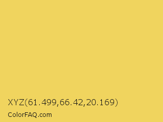 XYZ 61.499,66.42,20.169 Color is a light yellow color and the nearest color is Confetti #e9d75a. Hex code #f0d45e and RGB value is rgb(240,212,94). In RGB color space, this color is composed of 94% red, 83% green, 37% blue, In CMYK color space, this color is composed of 0% cyan, 12% magenta, 61% yellow , 6% black , In HSL color space, this color has a hue angle of 48° , 83% saturation and 65% lightness.