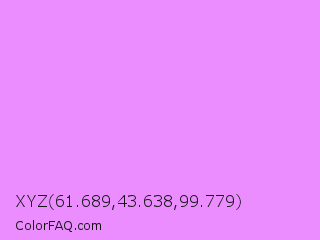 XYZ 61.689,43.638,99.779 Color is a light purple color and the nearest color is Lavender Magenta #ee82ee. Hex code #eb8cff and RGB value is rgb(235,140,255). In RGB color space, this color is composed of 92% red, 55% green, 100% blue, In CMYK color space, this color is composed of 8% cyan, 45% magenta, 0% yellow , 0% black , In HSL color space, this color has a hue angle of 290° , 100% saturation and 77% lightness.