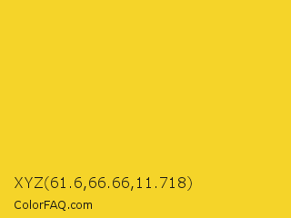 XYZ 61.6,66.66,11.718 Color is a normal yellow color and the nearest color is Golden Dream #f0d52d. Hex code #f5d429 and RGB value is rgb(245,212,41). In RGB color space, this color is composed of 96% red, 83% green, 16% blue, In CMYK color space, this color is composed of 0% cyan, 13% magenta, 83% yellow , 4% black , In HSL color space, this color has a hue angle of 50° , 91% saturation and 56% lightness.