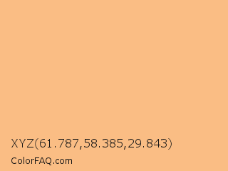 XYZ 61.787,58.385,29.843 Color is a light orange color and the nearest color is Macaroni And Cheese #ffbd88. Hex code #fabd84 and RGB value is rgb(250,189,132). In RGB color space, this color is composed of 98% red, 74% green, 52% blue, In CMYK color space, this color is composed of 0% cyan, 24% magenta, 47% yellow , 2% black , In HSL color space, this color has a hue angle of 29° , 92% saturation and 75% lightness.