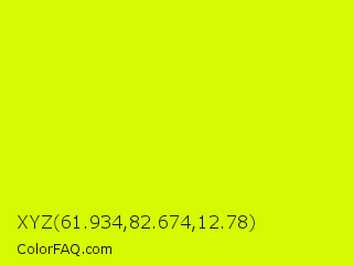 XYZ 61.934,82.674,12.78 Color is a normal yellow color and the nearest color is Volt #ceff00. Hex code #d6fa03 and RGB value is rgb(214,250,3). In RGB color space, this color is composed of 84% red, 98% green, 1% blue, In CMYK color space, this color is composed of 14% cyan, 0% magenta, 99% yellow , 2% black , In HSL color space, this color has a hue angle of 69° , 98% saturation and 50% lightness.
