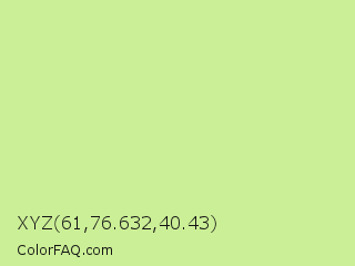 XYZ 61,76.632,40.43 Color is a light green color and the nearest color is Reef #c9ffa2. Hex code #cbef96 and RGB value is rgb(203,239,150). In RGB color space, this color is composed of 80% red, 94% green, 59% blue, In CMYK color space, this color is composed of 15% cyan, 0% magenta, 37% yellow , 6% black , In HSL color space, this color has a hue angle of 84° , 74% saturation and 76% lightness.