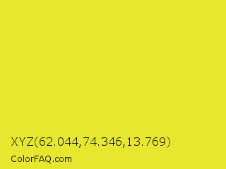 XYZ 62.044,74.346,13.769 Color is a normal yellow color and the nearest color is Dandelion #f0e130. Hex code #e7e72f and RGB value is rgb(231,231,47). In RGB color space, this color is composed of 91% red, 91% green, 18% blue, In CMYK color space, this color is composed of 0% cyan, 0% magenta, 80% yellow , 9% black , In HSL color space, this color has a hue angle of 60° , 79% saturation and 55% lightness.