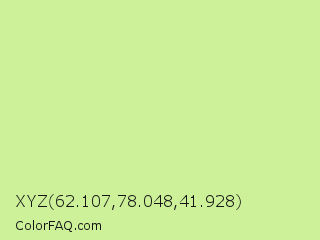 XYZ 62.107,78.048,41.928 Color is a light green color and the nearest color is Reef #c9ffa2. Hex code #ccf199 and RGB value is rgb(204,241,153). In RGB color space, this color is composed of 80% red, 95% green, 60% blue, In CMYK color space, this color is composed of 15% cyan, 0% magenta, 37% yellow , 5% black , In HSL color space, this color has a hue angle of 85° , 76% saturation and 77% lightness.