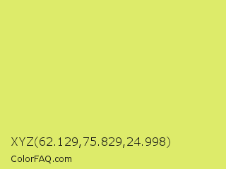 XYZ 62.129,75.829,24.998 Color is a light yellow color and the nearest color is Booger Buster #dde26a. Hex code #ddeb6a and RGB value is rgb(221,235,106). In RGB color space, this color is composed of 87% red, 92% green, 42% blue, In CMYK color space, this color is composed of 6% cyan, 0% magenta, 55% yellow , 8% black , In HSL color space, this color has a hue angle of 67° , 76% saturation and 67% lightness.