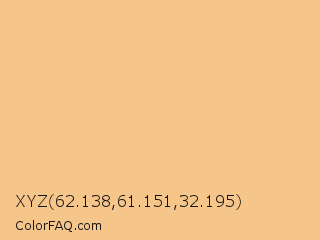 XYZ 62.138,61.151,32.195 Color is a light orange color and the nearest color is Macaroni And Cheese #ffbd88. Hex code #f5c589 and RGB value is rgb(245,197,137). In RGB color space, this color is composed of 96% red, 77% green, 54% blue, In CMYK color space, this color is composed of 0% cyan, 20% magenta, 44% yellow , 4% black , In HSL color space, this color has a hue angle of 33° , 84% saturation and 75% lightness.