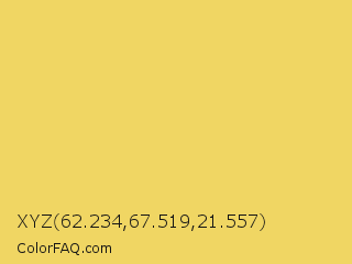 XYZ 62.234,67.519,21.557 Color is a light yellow color and the nearest color is Orange Yellow #f8d568. Hex code #f0d663 and RGB value is rgb(240,214,99). In RGB color space, this color is composed of 94% red, 84% green, 39% blue, In CMYK color space, this color is composed of 0% cyan, 11% magenta, 59% yellow , 6% black , In HSL color space, this color has a hue angle of 49° , 82% saturation and 66% lightness.