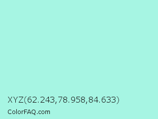 XYZ 62.243,78.958,84.633 Color is a very light cyan color and the nearest color is Ice Cold #b1f4e7. Hex code #a6f5e3 and RGB value is rgb(166,245,227). In RGB color space, this color is composed of 65% red, 96% green, 89% blue, In CMYK color space, this color is composed of 32% cyan, 0% magenta, 7% yellow , 4% black , In HSL color space, this color has a hue angle of 166° , 80% saturation and 81% lightness.