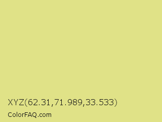 XYZ 62.31,71.989,33.533 Color is a light yellow color and the nearest color is Wild Rice #ece090. Hex code #e0e287 and RGB value is rgb(224,226,135). In RGB color space, this color is composed of 88% red, 89% green, 53% blue, In CMYK color space, this color is composed of 1% cyan, 0% magenta, 40% yellow , 11% black , In HSL color space, this color has a hue angle of 61° , 61% saturation and 71% lightness.