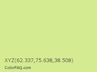 XYZ 62.337,75.638,38.508 Color is a light lime color and the nearest color is Deco #d2da97. Hex code #d5eb92 and RGB value is rgb(213,235,146). In RGB color space, this color is composed of 84% red, 92% green, 57% blue, In CMYK color space, this color is composed of 9% cyan, 0% magenta, 38% yellow , 8% black , In HSL color space, this color has a hue angle of 75° , 69% saturation and 75% lightness.