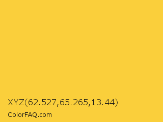 XYZ 62.527,65.265,13.44 Color is a light yellow color and the nearest color is Bright Sun #fed33c. Hex code #facf3b and RGB value is rgb(250,207,59). In RGB color space, this color is composed of 98% red, 81% green, 23% blue, In CMYK color space, this color is composed of 0% cyan, 17% magenta, 76% yellow , 2% black , In HSL color space, this color has a hue angle of 46° , 95% saturation and 61% lightness.