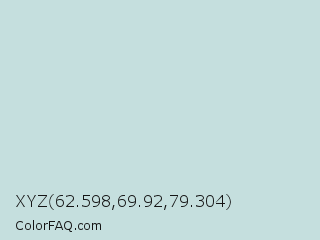XYZ 62.598,69.92,79.304 Color is a very light cyan color and the nearest color is Botticelli #c7dde5. Hex code #c5dfde and RGB value is rgb(197,223,222). In RGB color space, this color is composed of 77% red, 87% green, 87% blue, In CMYK color space, this color is composed of 12% cyan, 0% magenta, 0% yellow , 13% black , In HSL color space, this color has a hue angle of 178° , 29% saturation and 82% lightness.