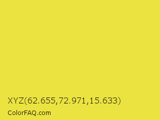 XYZ 62.655,72.971,15.633 Color is a normal yellow color and the nearest color is Sandstorm #ecd540. Hex code #ebe340 and RGB value is rgb(235,227,64). In RGB color space, this color is composed of 92% red, 89% green, 25% blue, In CMYK color space, this color is composed of 0% cyan, 3% magenta, 73% yellow , 8% black , In HSL color space, this color has a hue angle of 57° , 81% saturation and 59% lightness.
