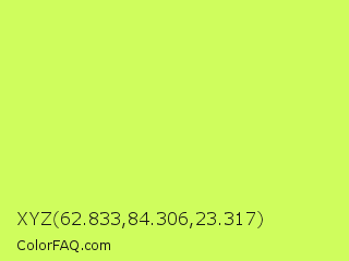 XYZ 62.833,84.306,23.317 Color is a light lime color and the nearest color is Maximum Green Yellow #d9e650. Hex code #cffd5d and RGB value is rgb(207,253,93). In RGB color space, this color is composed of 81% red, 99% green, 36% blue, In CMYK color space, this color is composed of 18% cyan, 0% magenta, 63% yellow , 1% black , In HSL color space, this color has a hue angle of 77° , 98% saturation and 68% lightness.